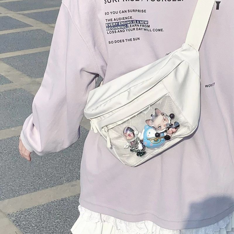متجر وو دونغ الصغير الأصلي اليومي المتوافق مع الموضة حقيبة الألم الشفافة حقيبة الطفل حقيبة الكتف الخصر حقيبة الصدر حقيبة قماش كروسبودي للنساء