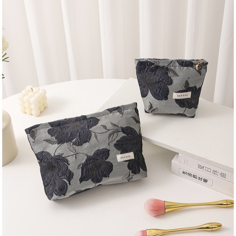 حقيبة مستحضرات تجميل من قماش الجاكار الحريري باللون الأزرق الداكن والذهبي على الطراز الكوري، حقيبة صغيرة محمولة ذات سعة كبيرة، حقيبة تخزين للغسيل