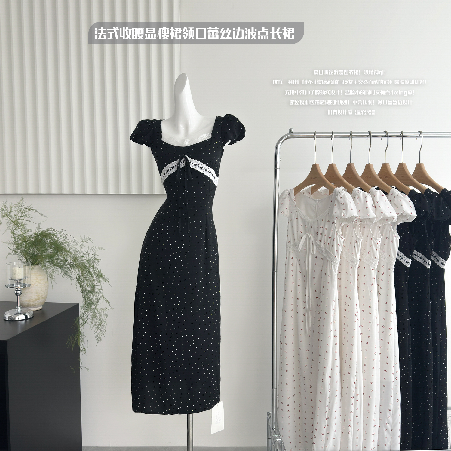 تنورة طويلة بحافة دانتيل بناتي منقطة مع خط عنق على الخصر الفرنسي