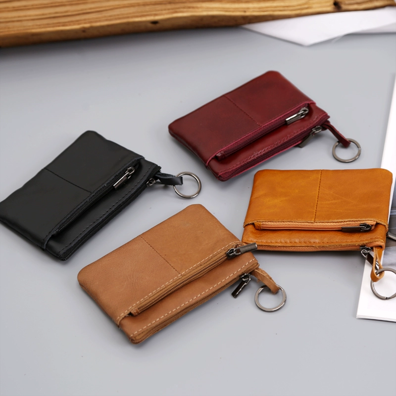 محفظة رجالية صغيرة من جلد البقر – حقيبة جلدية رفيعة للغاية بسحاب للعملات المعدنية، حقيبة مفاتيح صغيرة قصيرة