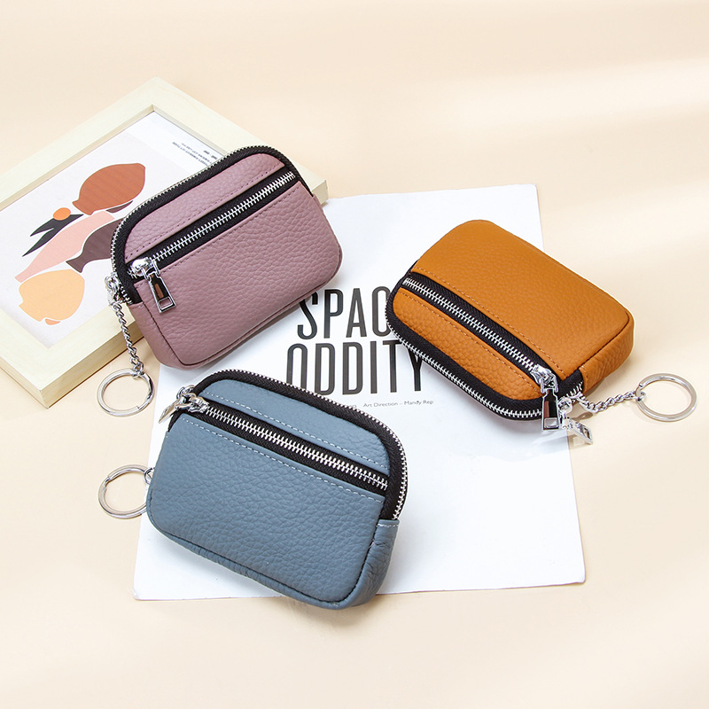 محفظة نقود من الجلد الطبيعي بسلسلة مفاتيح صغيرة من جلد البقر ذو لون متباين وسحاب محفظة صغيرة لتخزين العملات المعدنية للسيدات