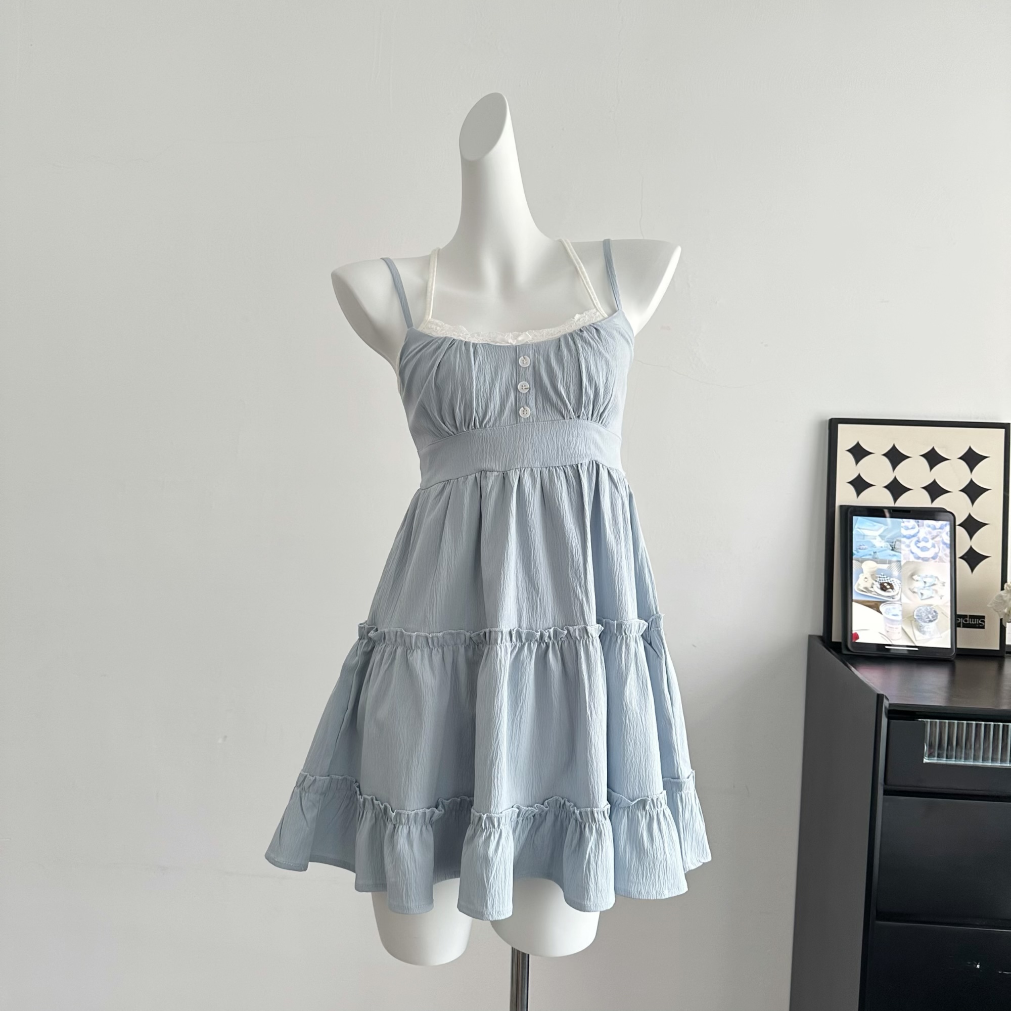 فستان كعكة الربيع الأزرق محلية الصنع عالية الخصر تناسب