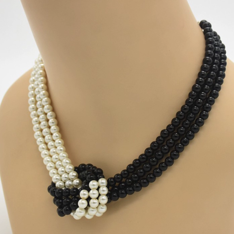 عقد عصري معقود على شكل ترقوة للنساء متعدد الطبقات من اللؤلؤ الأسود والأبيض
