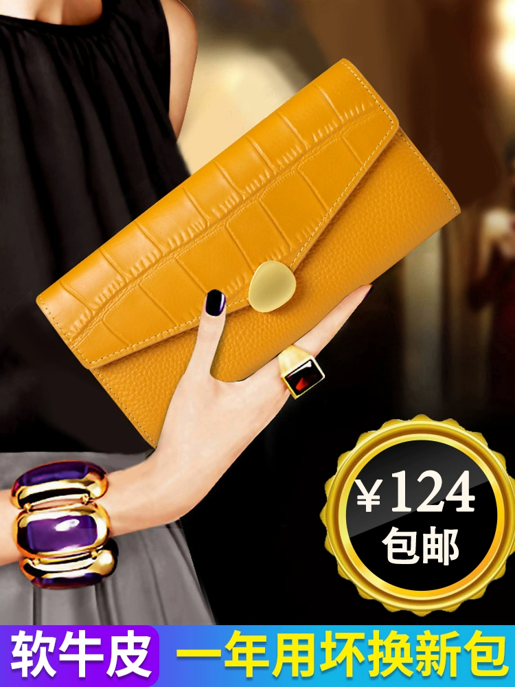 محفظة جلدية أصلية ذات سعة كبيرة باللون الأصفر للنساء 2024 محفظة يد جديدة بنمط تمساح ناعم من جلد البقر لحقيبة الهاتف المحمول