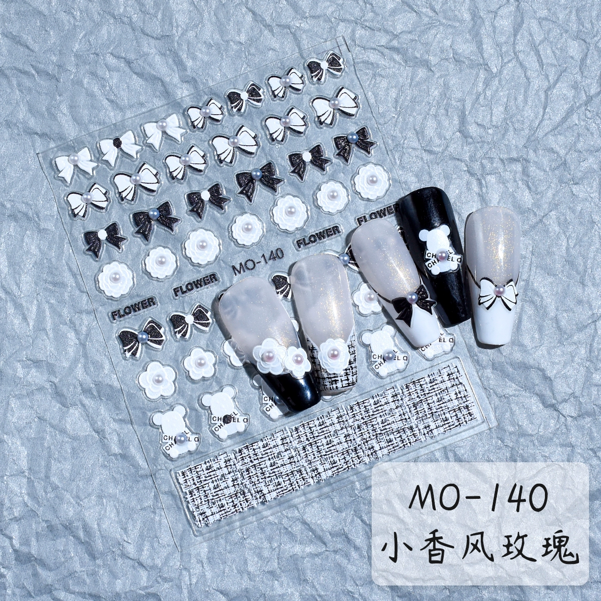 ملصقات أظافر منقوشة صغيرة معطرة باللونين الأبيض والأسود ولؤلؤ الماس والكاميليا والدب والزهور الوردية