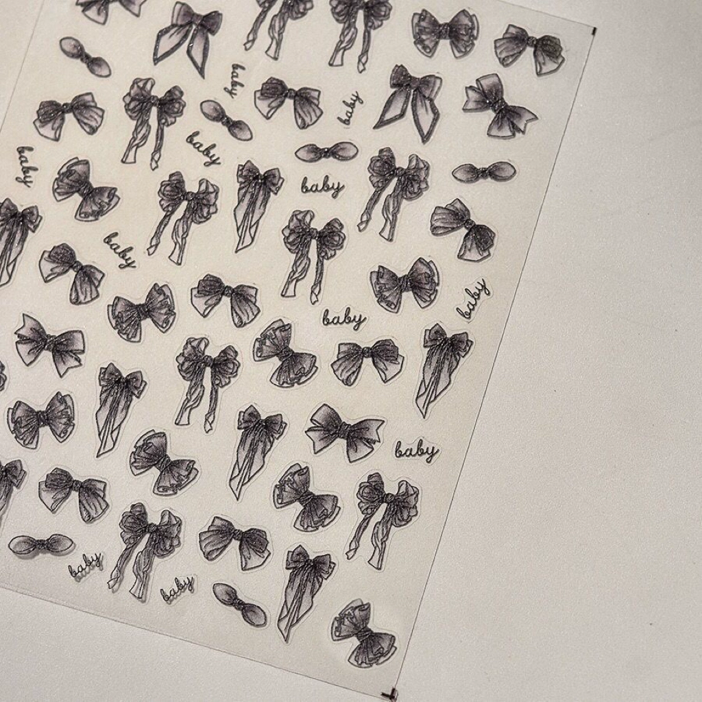 شاش المشاهير على الإنترنت مع مانيكير بفيونكة أبيض وأسود منقوش ثلاثي الأبعاد من الدانتيل الأسود وملصقات مانيكير فرنسية متعددة الاستخدامات