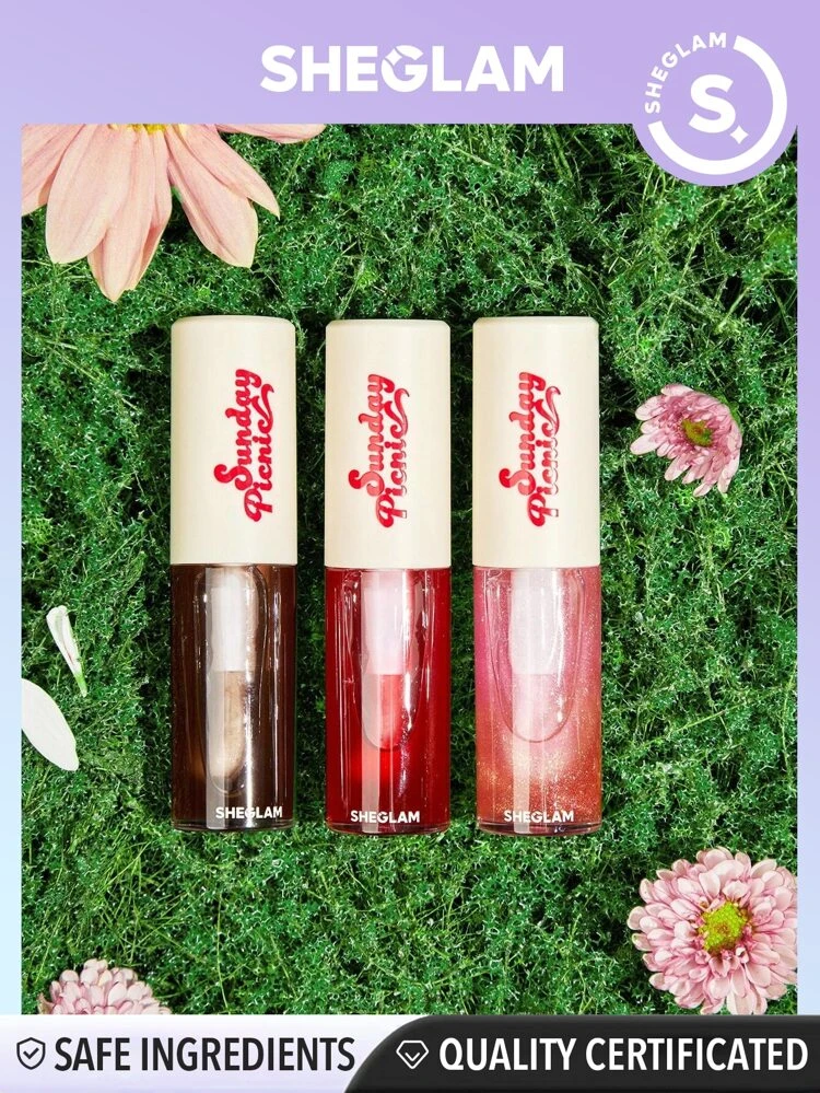 مجموعة من 3 زيوت شفاه من SHEGLAM برائحة الكيك، لترطيب وتغذية الشفاه بلمسة نهائية عالية اللمعان.