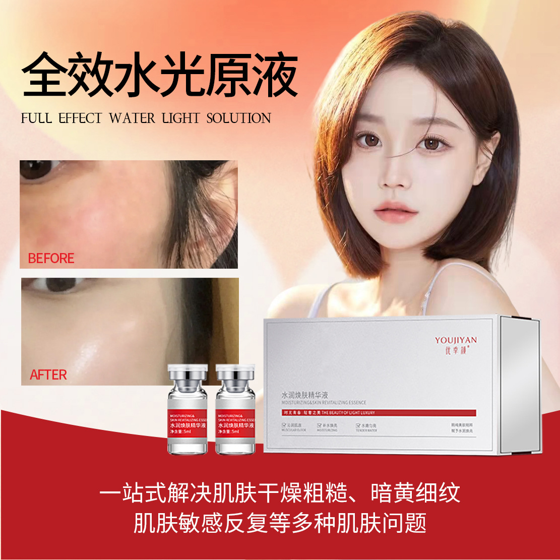 Youji Yan كامل التأثير ضوء الماء العنصر الحركي محلول المخزون الكولاجين ببتيد حمض الهيالورونيك المسام ترقق صالون تجميل مقدمة