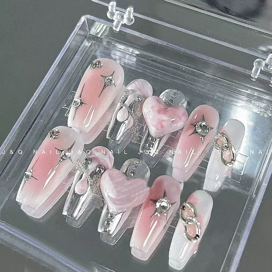 أحمر خدود ملطخ باللؤلؤ والماس، مانيكير يمكن ارتداؤه، أظافر صناعية ملونة برقائق الذهب الفرنسية، منتج نهائي