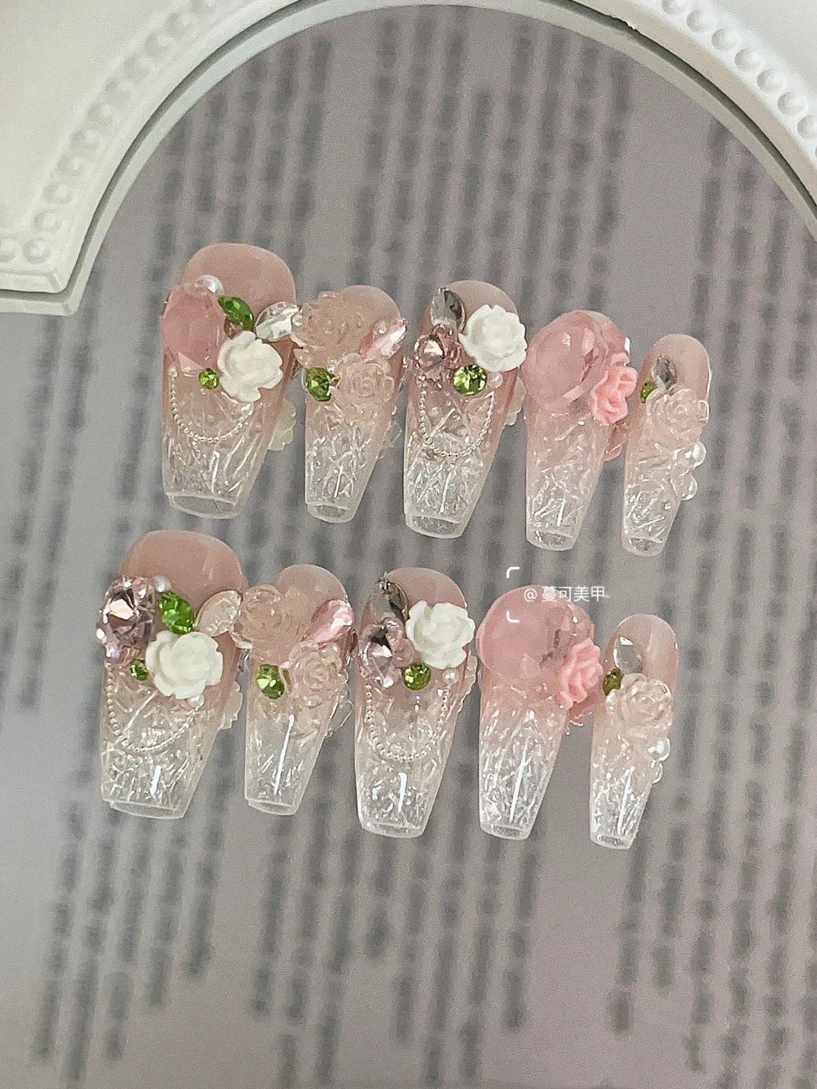 وردة مجمدة مُعاد نقشها|زجاج شفاف أخضر راقي للصيف لطيف وتبييض أظافر نقي مصنوع يدويًا