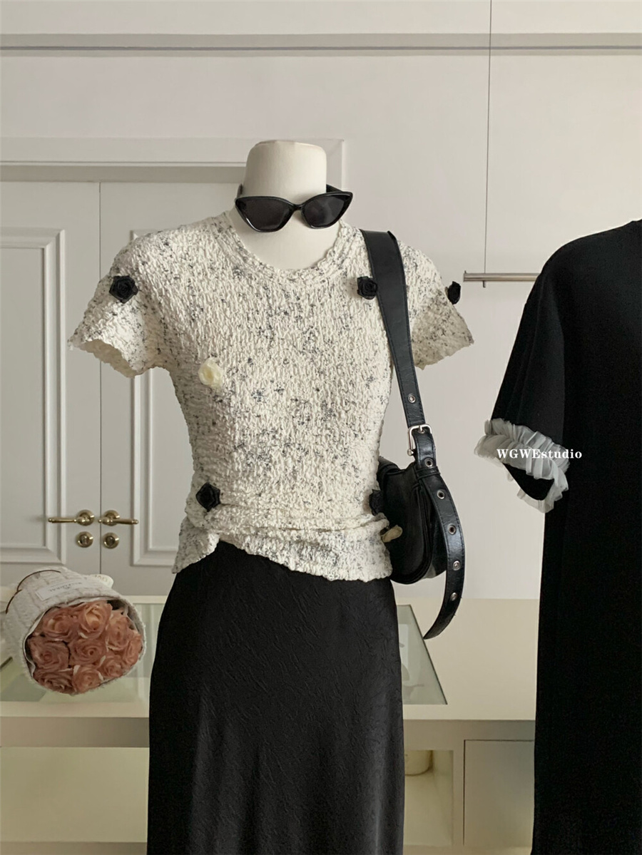 WGWE المرأة الصيف الجديدة الصغيرة ثلاثية الأبعاد زهرة الورد قصيرة الأكمام تي شيرت تصميم فتاة الساخنة أعلى قصيرة
