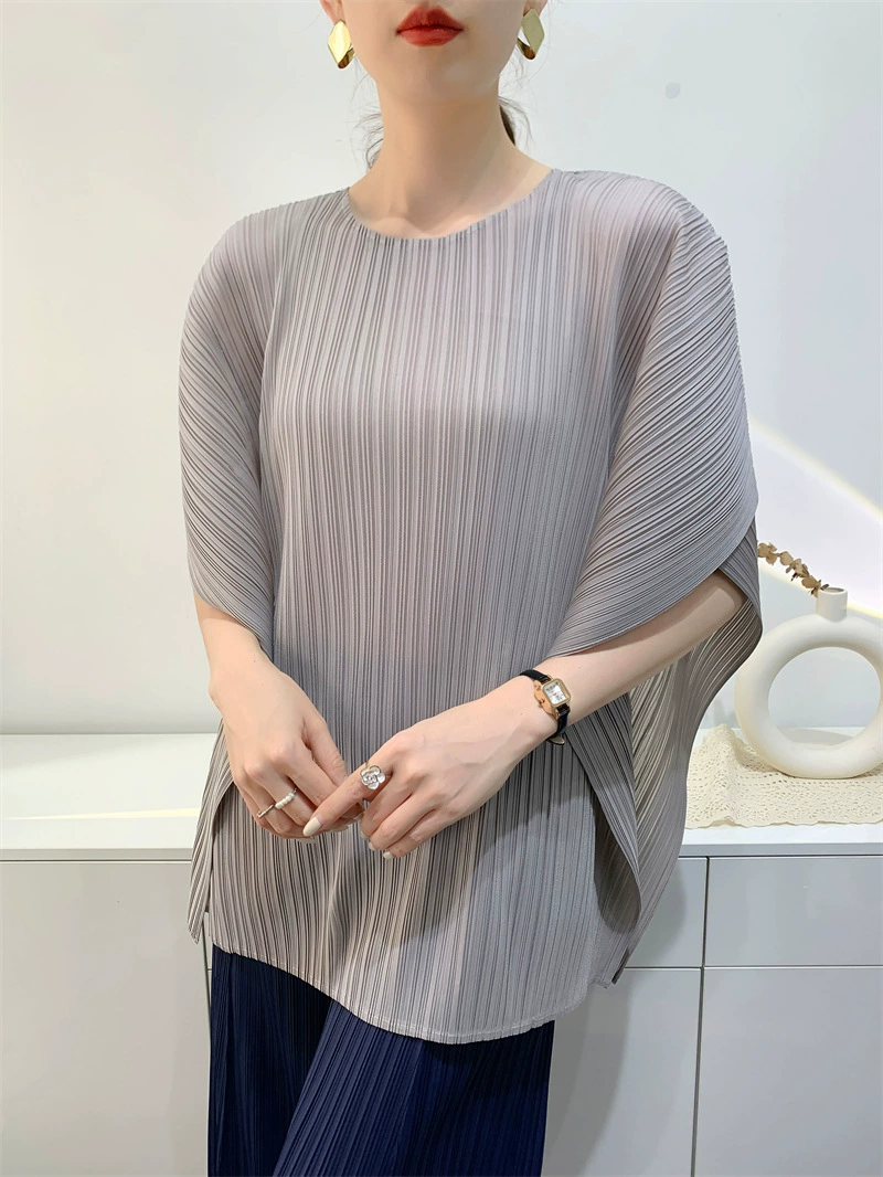 مياكي تصميم مطوي المرأة 2024 الصيف حجم كبير فضفاض سليم عادية شق الجولة الرقبة تي شيرتات قصيرة الاكمام