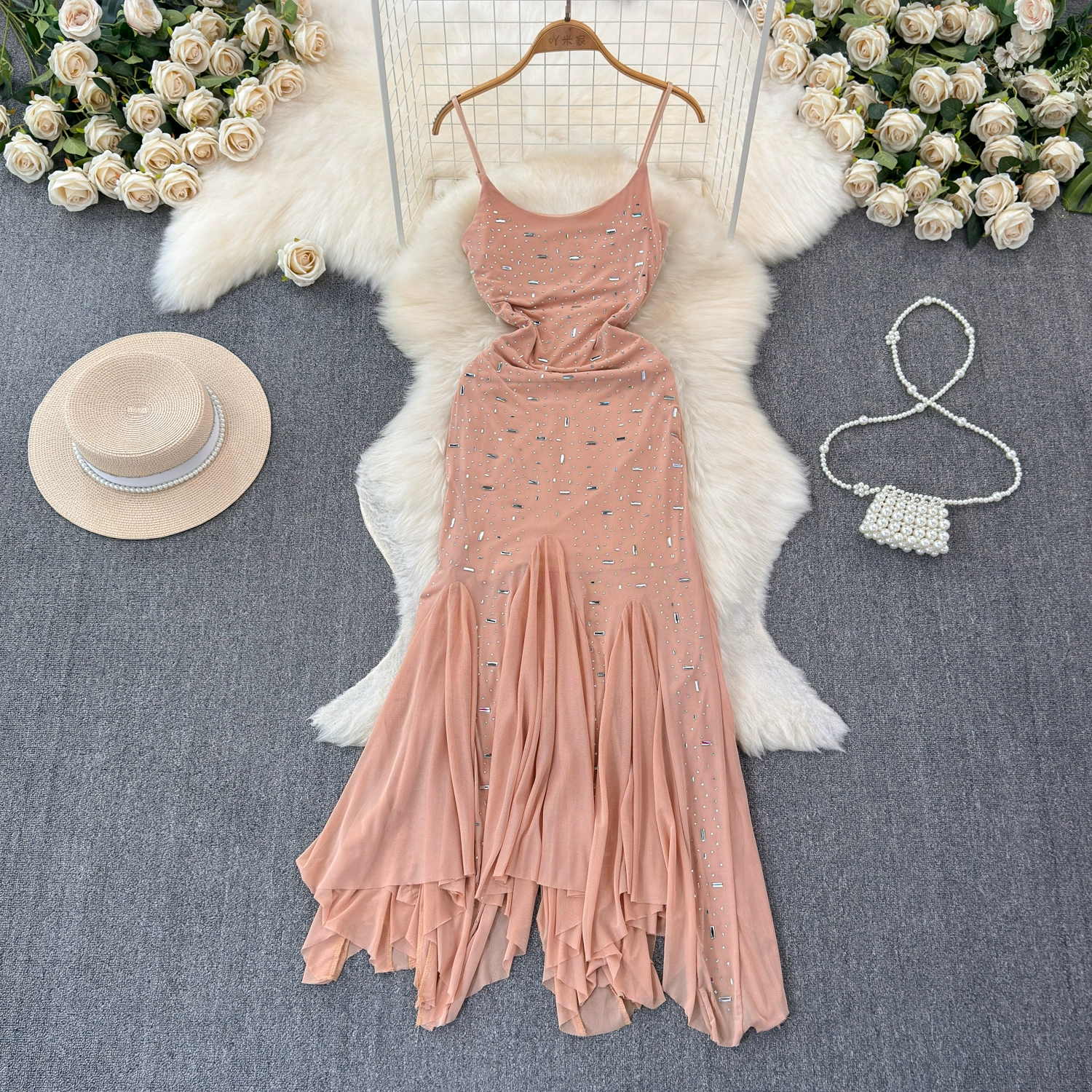 Yujie الراقية مزاجه اللباس حفل عشاء فستان طويل المألوف الساخن الماس حزام الخصر شبكة فستان غير منتظم