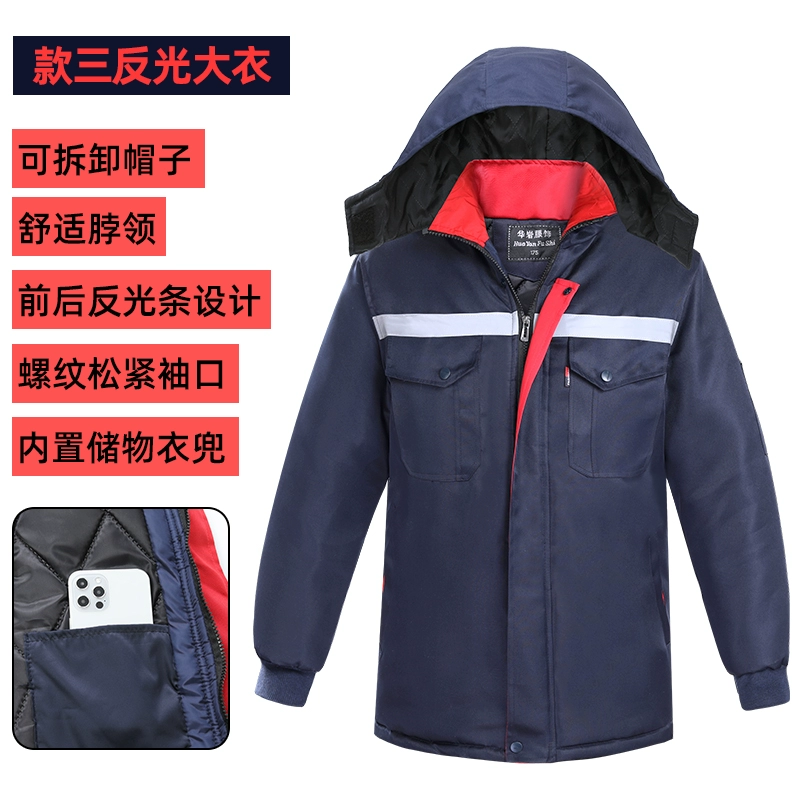 ملابس عمل شتوية سميكة، معاطف قطنية، ملابس قطنية رجالية دافئة مقاومة للبرد، شرائط عاكسة للضوء، حماية العمال، تخزين بارد، موقع بناء، سترات قطنية