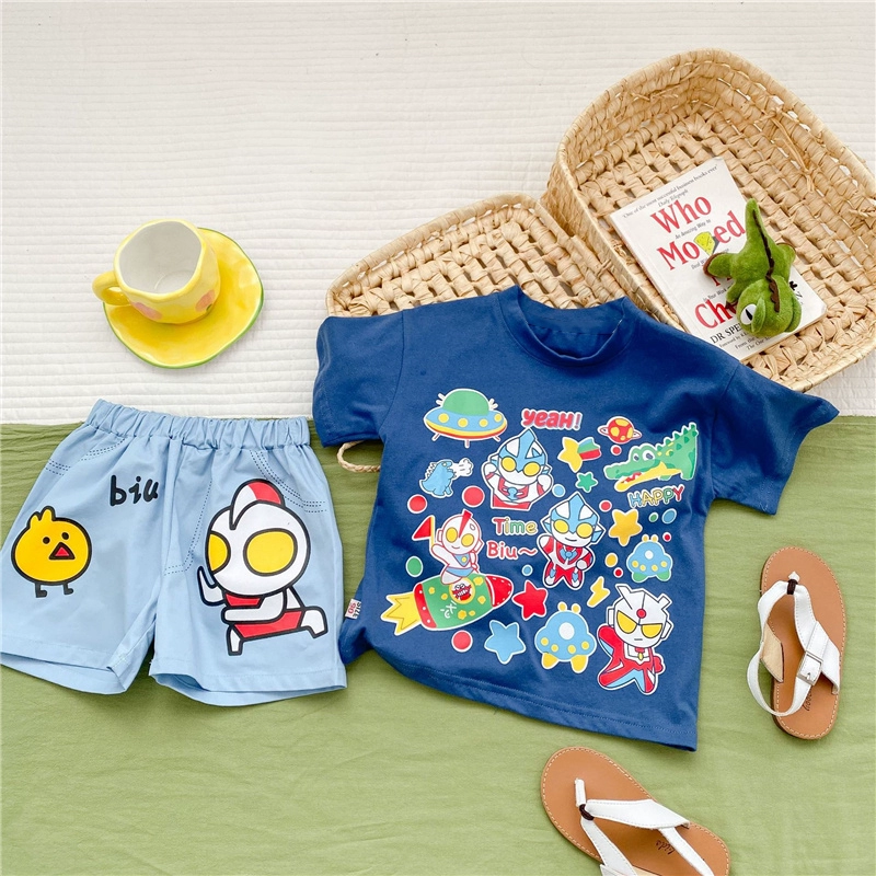 ملابس أطفال ورضع على الطراز الكوري فضفاضة بتصميم كرتوني سوبرمان بأكمام قصيرة