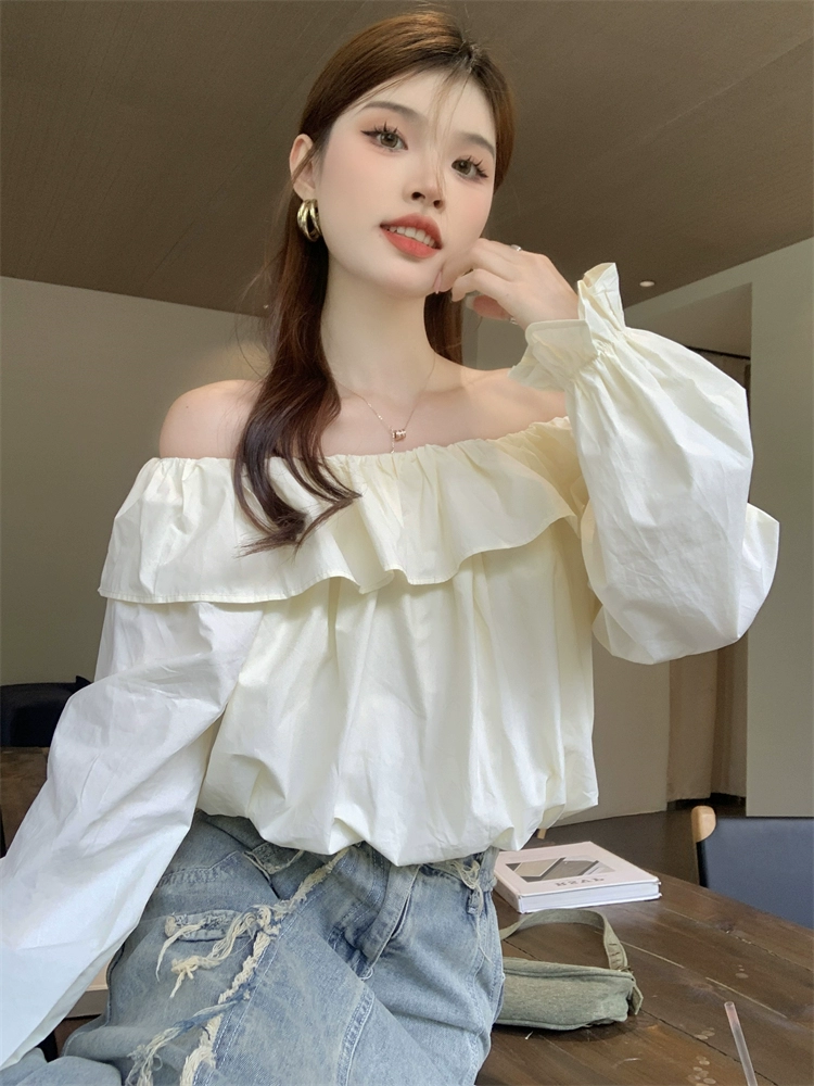 قميص قصير ذو لون خالص ورقبة واحدة فضفاض وأكمام طويلة مكون من قطعتين