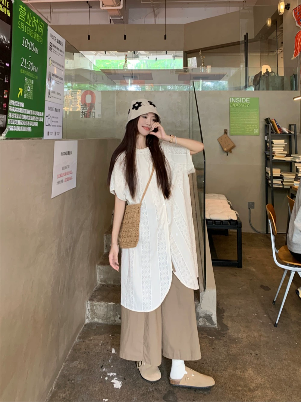 سروال الشاي واسع الساق وسترة بيضاء من قطعتين