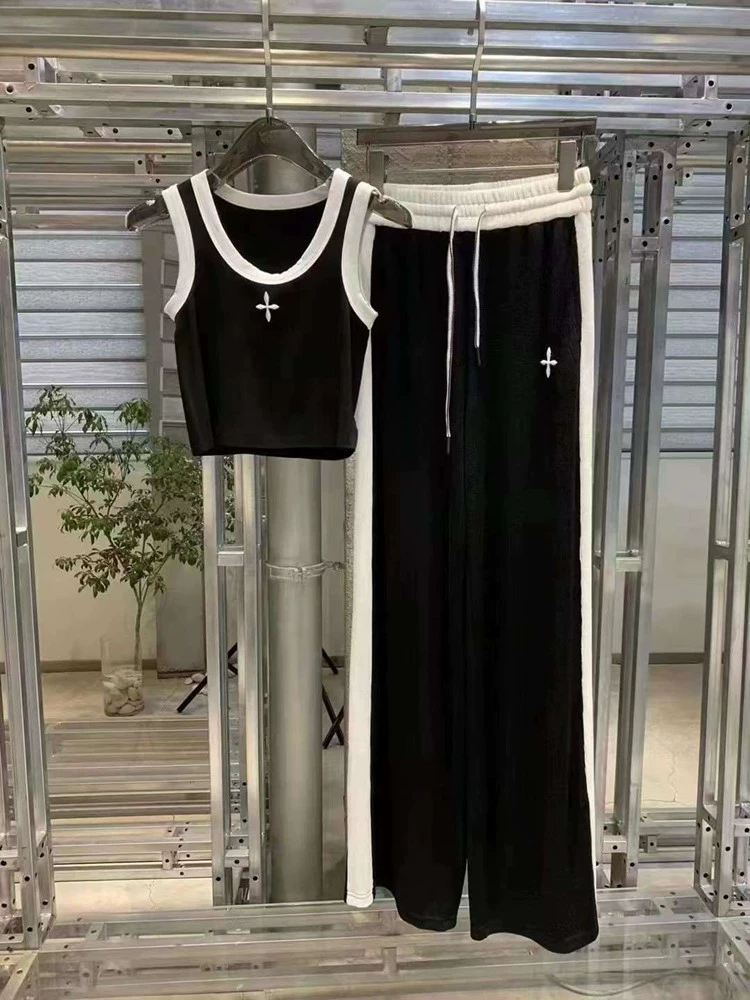بدلة رياضية غير رسمية عصرية لمشاهير الإنترنت للنساء صيف جديد أنيق سترة قصيرة عالية الخصر بنطال ذو قصة أرجل واسعة طقم مكون من قطعتين