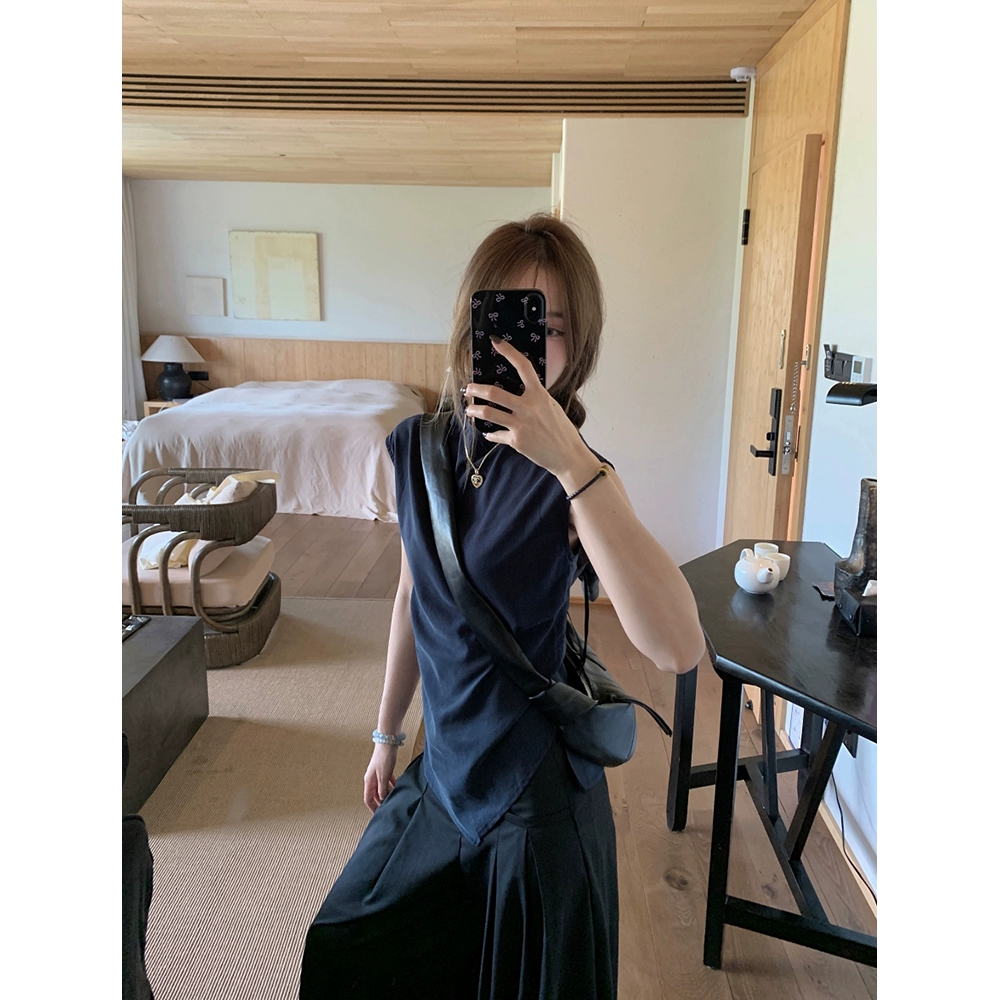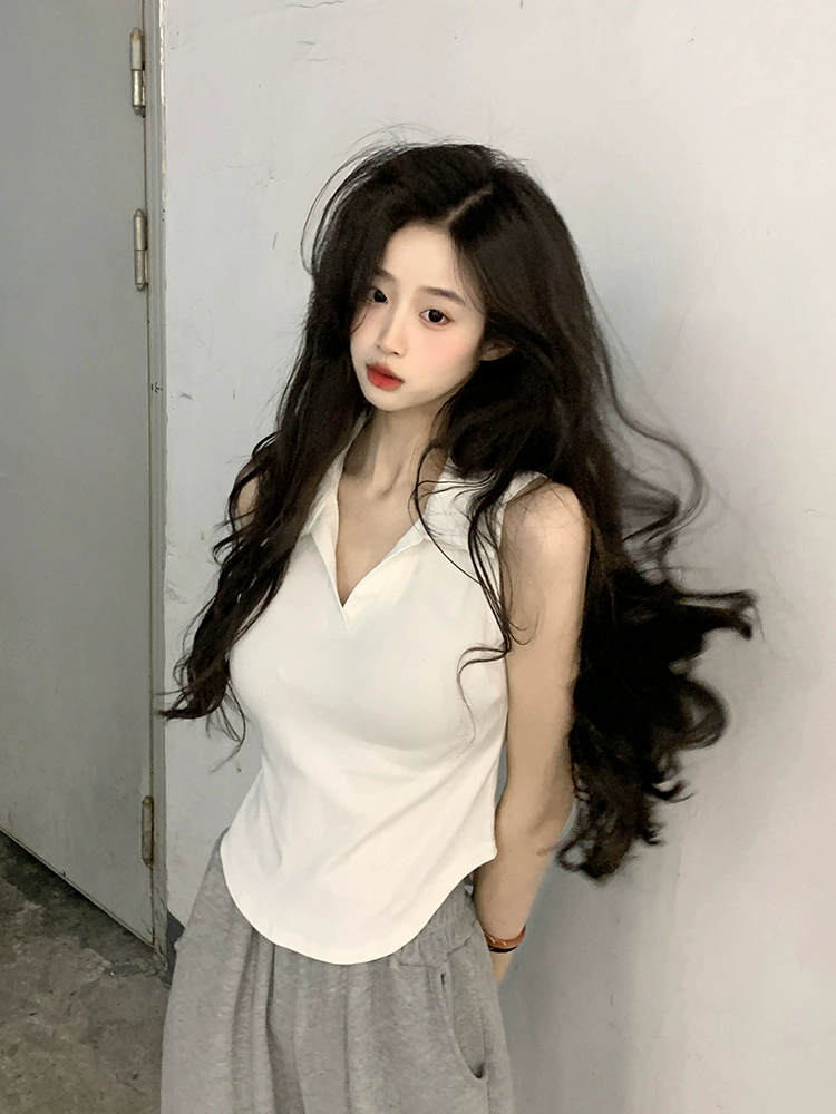 قميص نسائي صيفي كوري بدون أكمام مع أزرار خلفية بطول الأرض