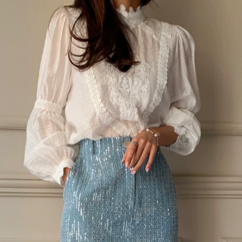 قميص بأكمام طويلة على طراز القصر في أوائل الربيع مع تطريز في الأعلى
