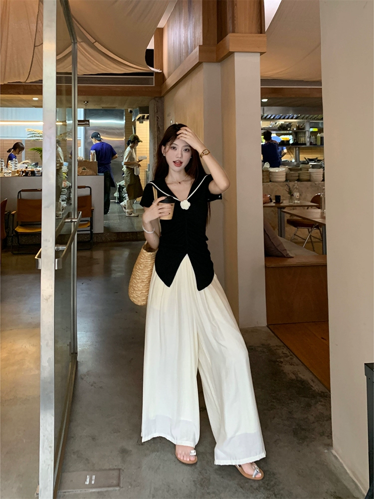 سروال أبيض حليبي ياماموتو نسائي صيفي رقيق عالي الخصر ثنى الحرير الجليدي خلات نسيج صغير بنطال ذو قصة أرجل واسعة