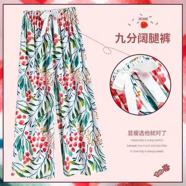 بنطلون بيجامة من الحرير القطني للنساء في الصيف، بنطال فضفاض كبير الحجم بأرجل واسعة، بنطال ملون مطبوع تسع نقاط للارتداء في المنزل والخارج، بنطال قطن صناعي