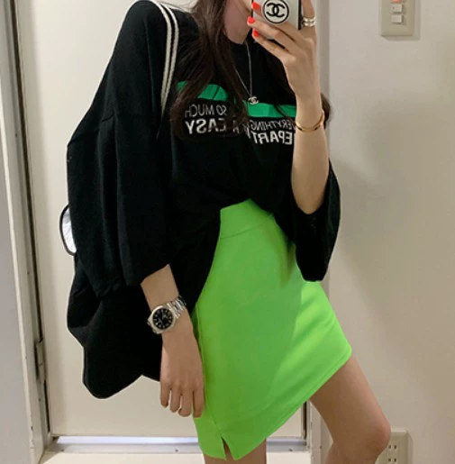 تنورة كورية ذات لون فلورسنت ملفت للنظر مع فتحة عند الحاشية