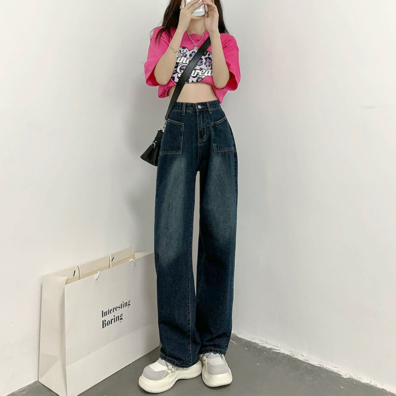 جينز درابي نيش عالي الخصر للتخسيس وساق مستقيمة وطول يصل إلى الأرض