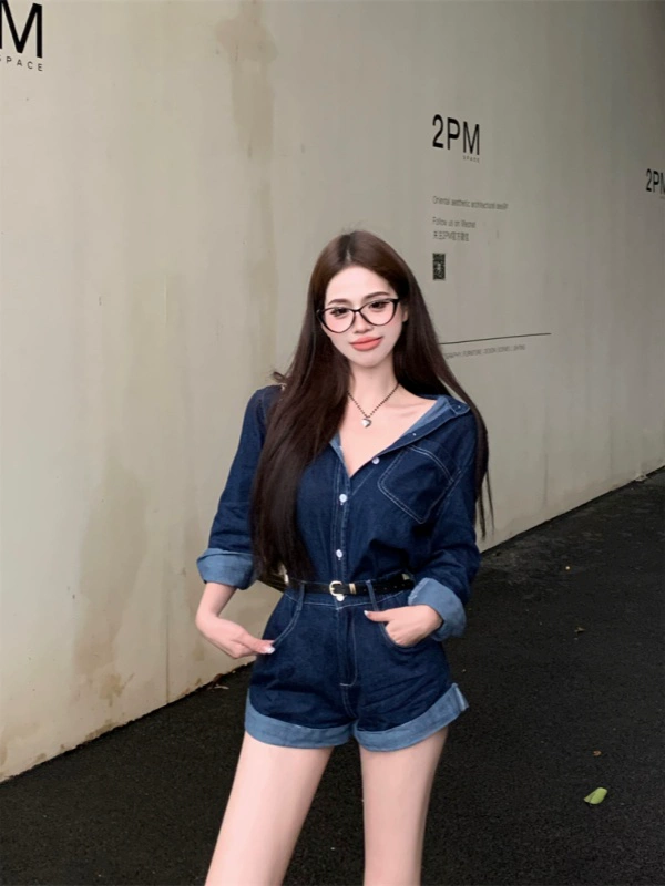 قميص دينم ريترو نحيف كاجوال مكون من قطعتين بأكمام طويلة