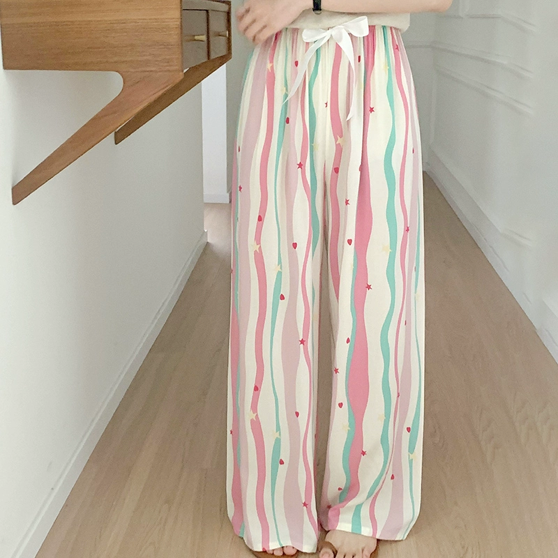 الفتيات القطن الحرير واسعة الساق السراويل بيجامة السراويل النسائية رقيقة فضفاضة مستقيم عارضة السراويل الطويلة عالية الخصر ثنيات مخطط الطابق التطهير السراويل