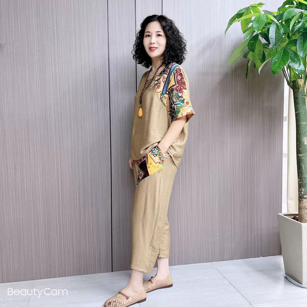تي شيرت الأم في منتصف العمر على الطراز العرقي مقاس كبير من القطن والكتان ايوسل