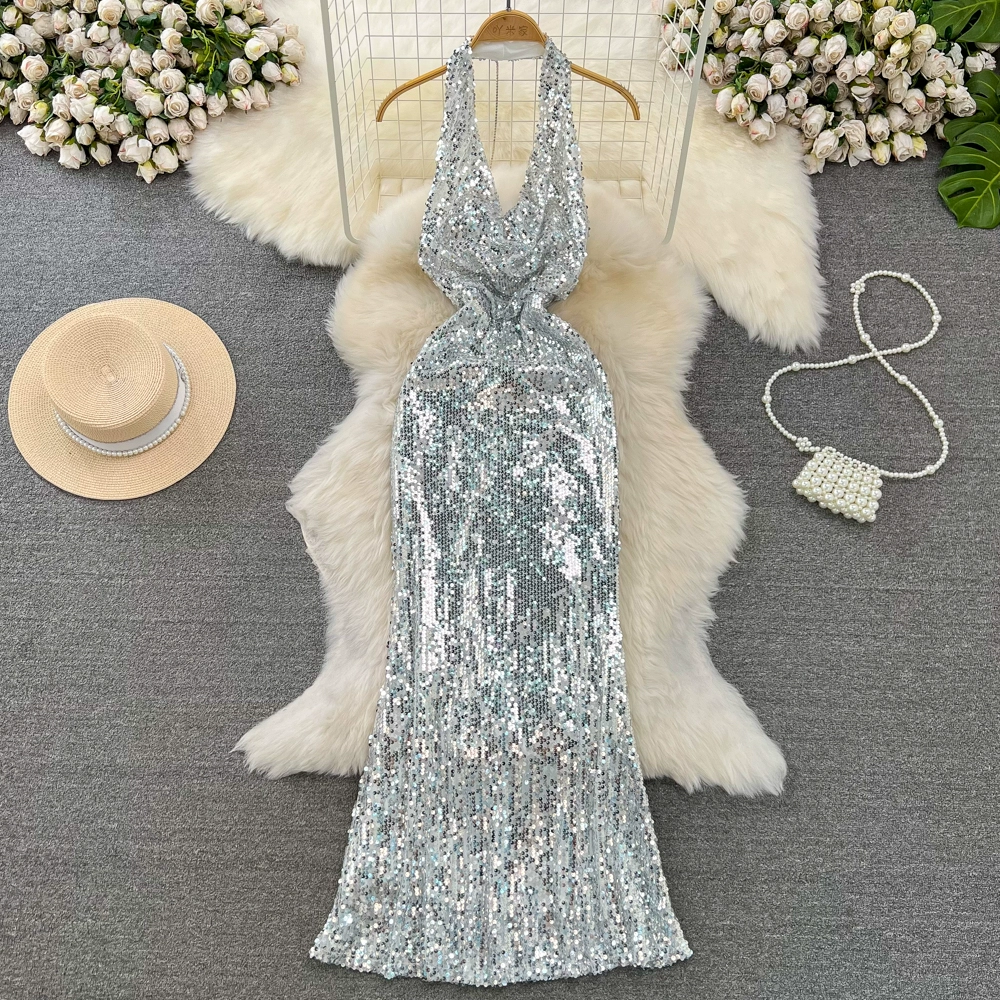 فستان فضي فاخر خفيف على شكل ذيل السمكة بدون ظهر مع ترتر
