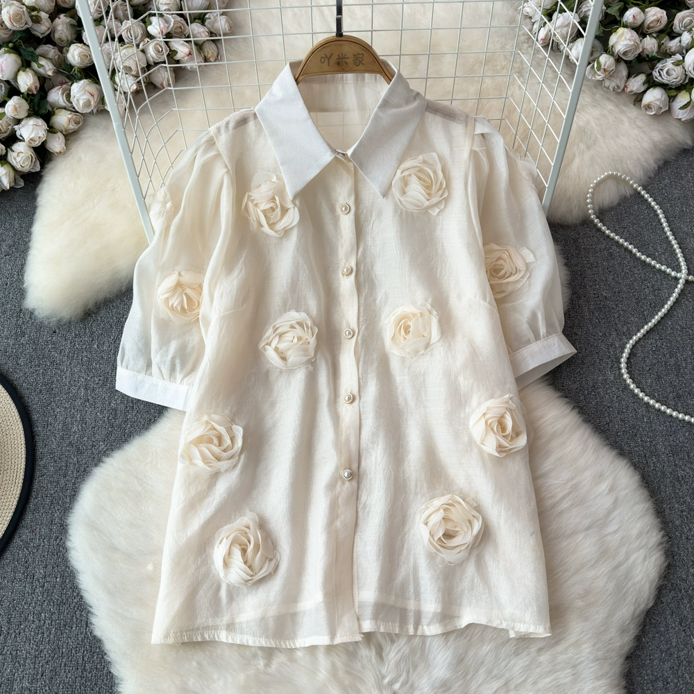 الصناعة الثقيلة الفرنسية ثلاثية الأبعاد زهرة الربط نفخة الأكمام ايوسل قميص قصير الأكمام من المألوف فضفاضة نفاذية قليلا مزاجه الأعلى العصرية