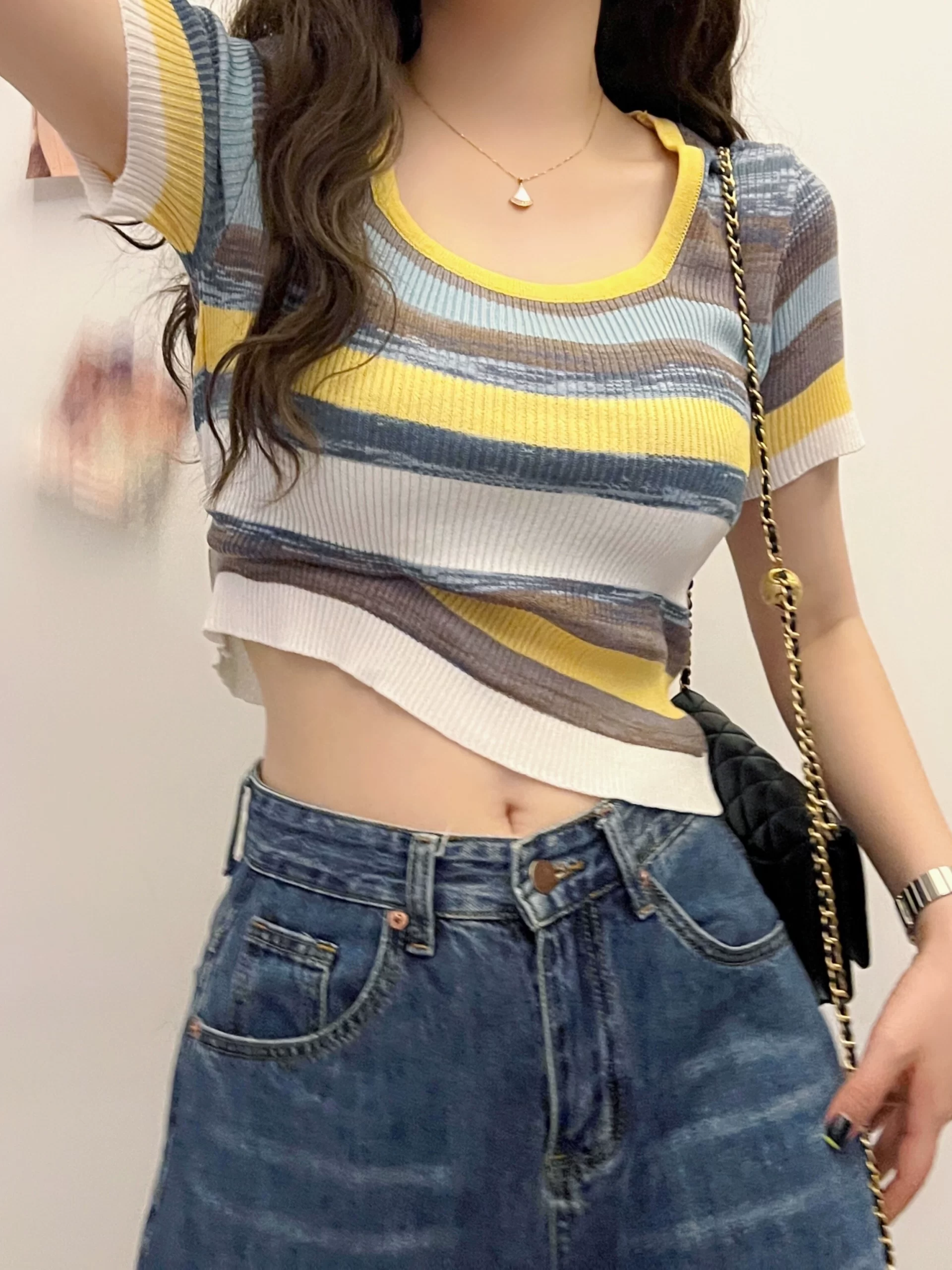 تي شيرت شيتاكي قوس قزح مخطط الدوبامين بقصة ضيقة وأكمام قصيرة