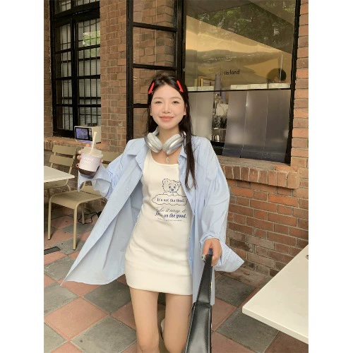 اليابانية الرجعية الدنيم الأزرق الداكن الدب قميص قصير الأكمام