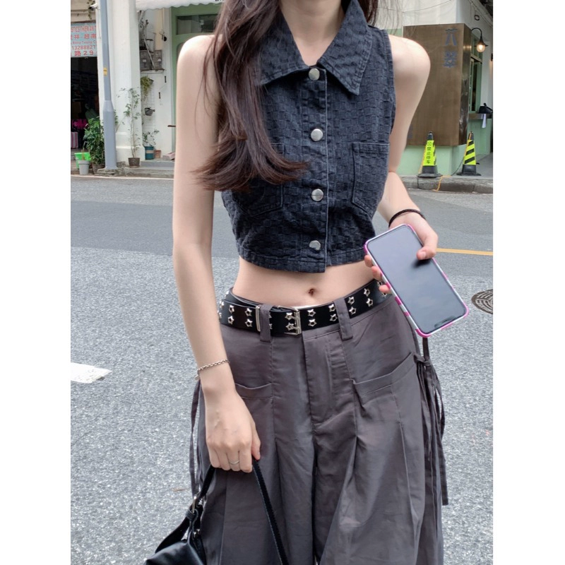 الشارع بارد الدنيم بلا أكمام ضئيلة الرقبة الرسن قصيرة