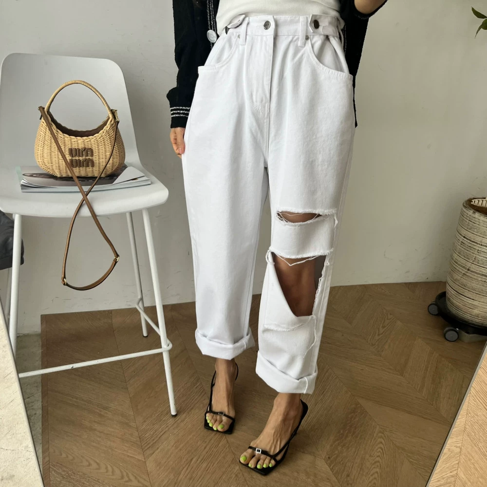 Dongdaemun Ins بنطال جينز ممزق بخصر مرن باللون الوردي