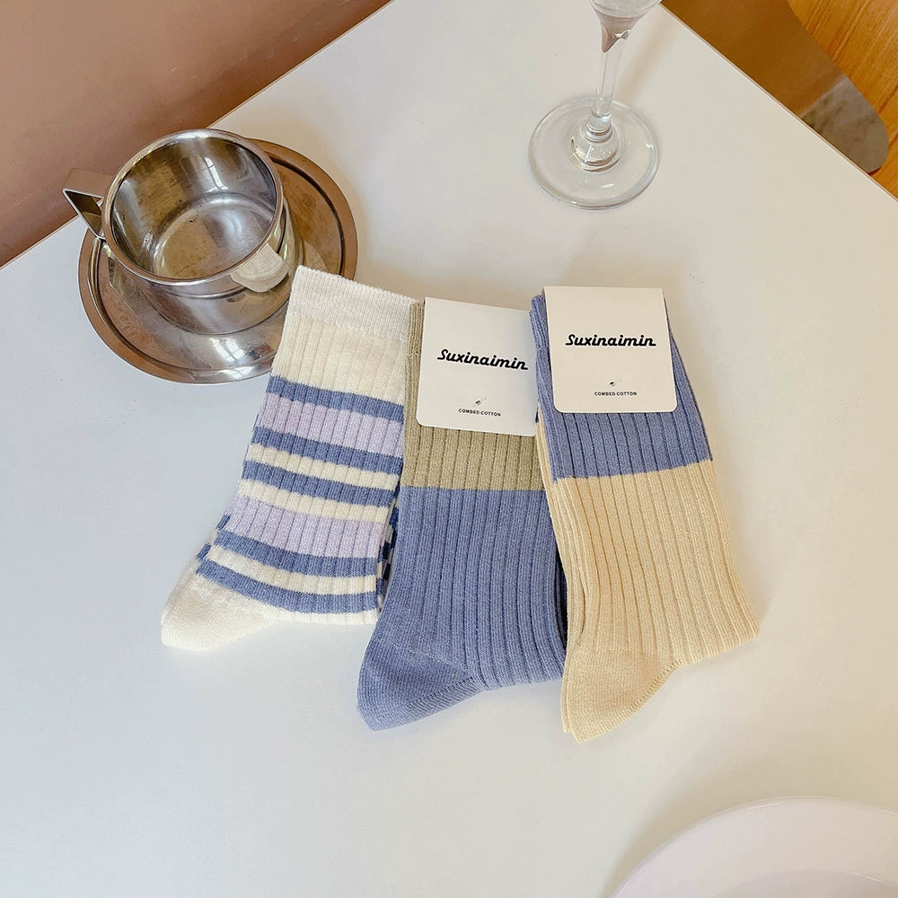 جوارب طويلة رياضية كورية سميكة من القطن الخالص للسيدات مخططة عصرية
