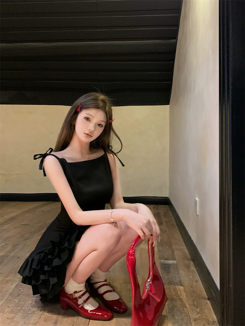 فستان صيفي مثير بحمالات مع فيونكة سوداء