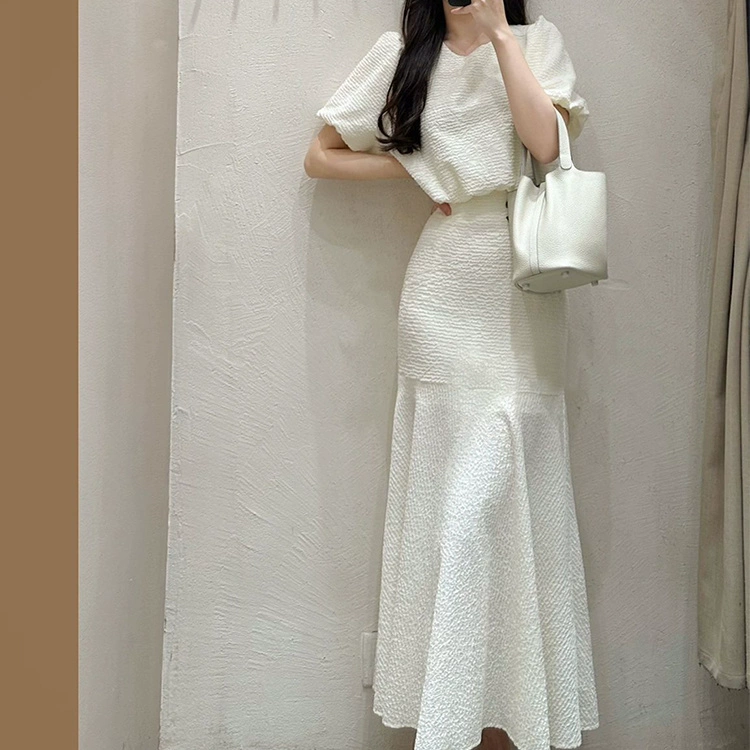 فستان نسائي صيفي جديد بأكمام منتفخة بتصميم كلاسيكي موديل 2024 بخصر مطاطي تنورة نسائية ضيقة متوسطة الطول