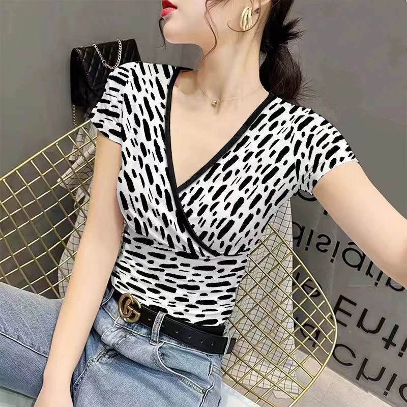 تي شيرت نسائي صيفي برقبة على شكل حرف V بقصة ضيقة ومطبوع من الحرير الجليدي
