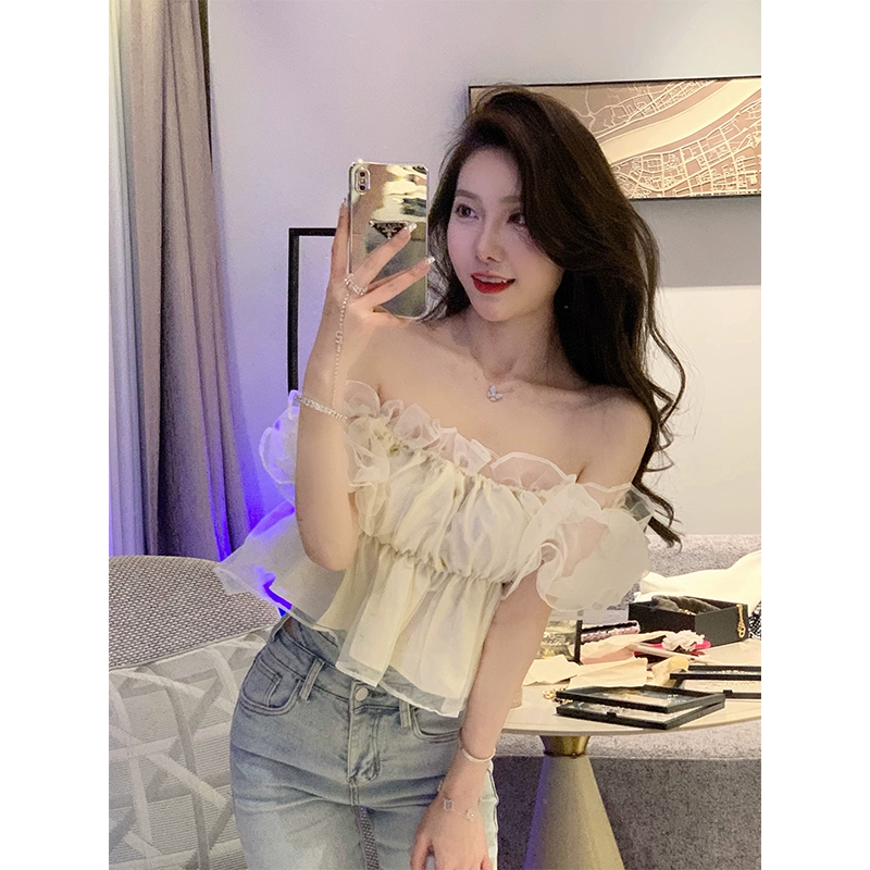 بلوزة بياقة مربعة وكتف واحد مع شبكة تنحيف بأكمام قصيرة