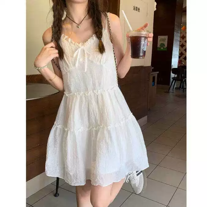 تنورة دانتيل بحمالات، صيف جميل الحب الأول من الدانتيل الحلو الحليبي
