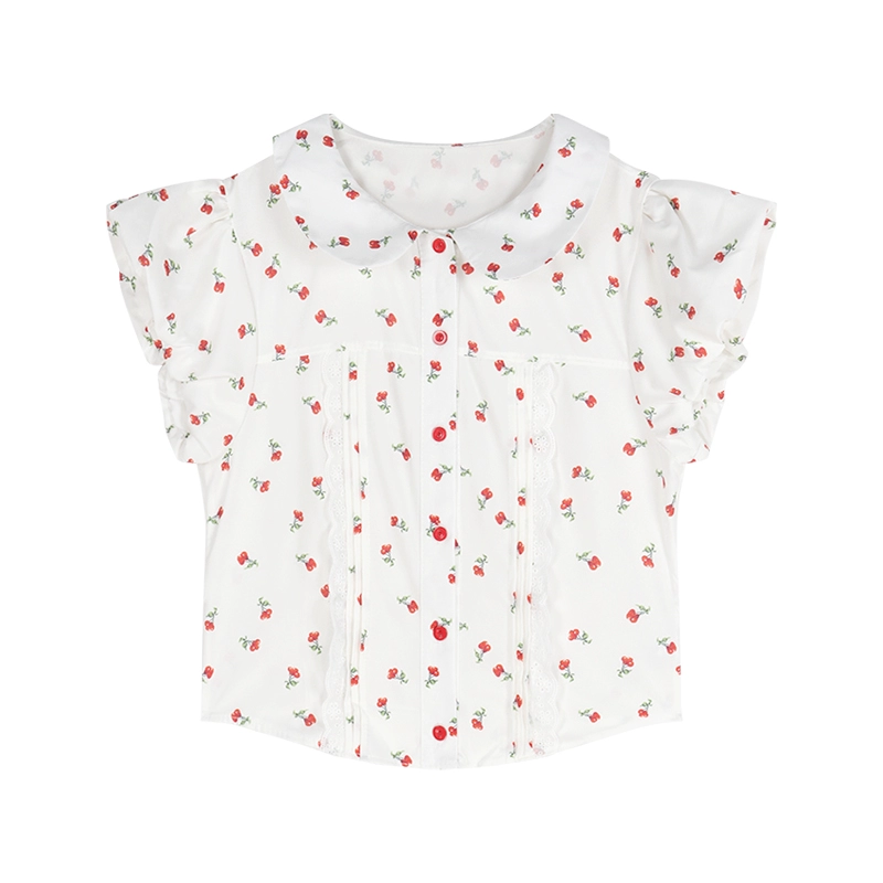 قميص بياقة الدمية بطبعة الكرز، مقاس نحيف، أبيض بأكمام قصيرة