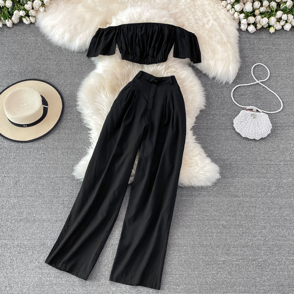 بنطال علوي بخصر عالٍ ومستقيم وواسع الساق مكشوف الأكتاف