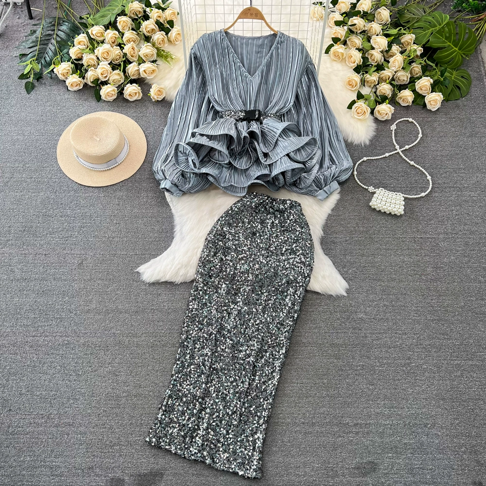 بدلة لامعة على شكل فانوس المشاهير ورقبة على شكل حرف V من أوراق اللوتس