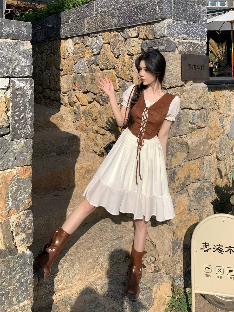 سترة فتاة صيفية فرنسية سمينة الربط فستان بأكمام قصيرة