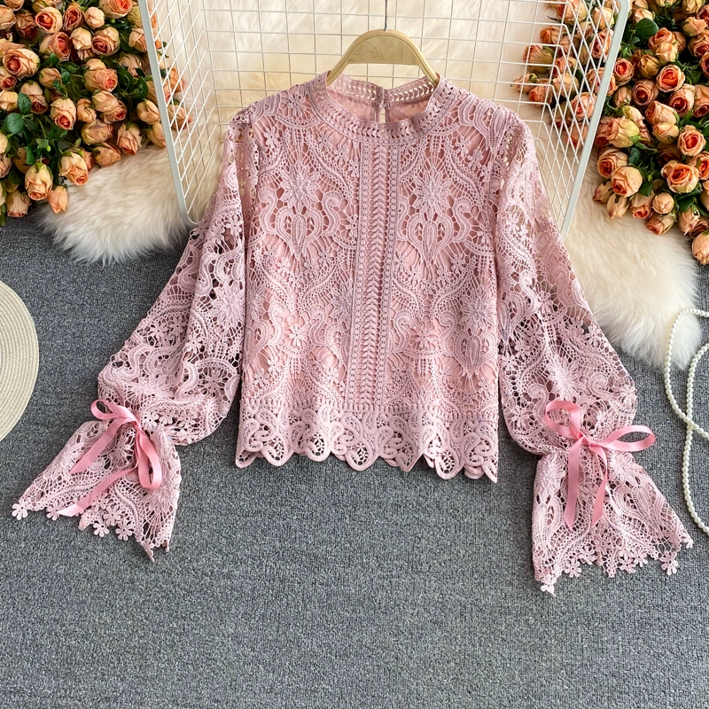 الفرنسية الرجعية قصر نمط للذوبان في الماء جوفاء الدانتيل قميص جرس كم طويل الأكمام مزاجه الصدر الوقوف طوق أعلى للنساء