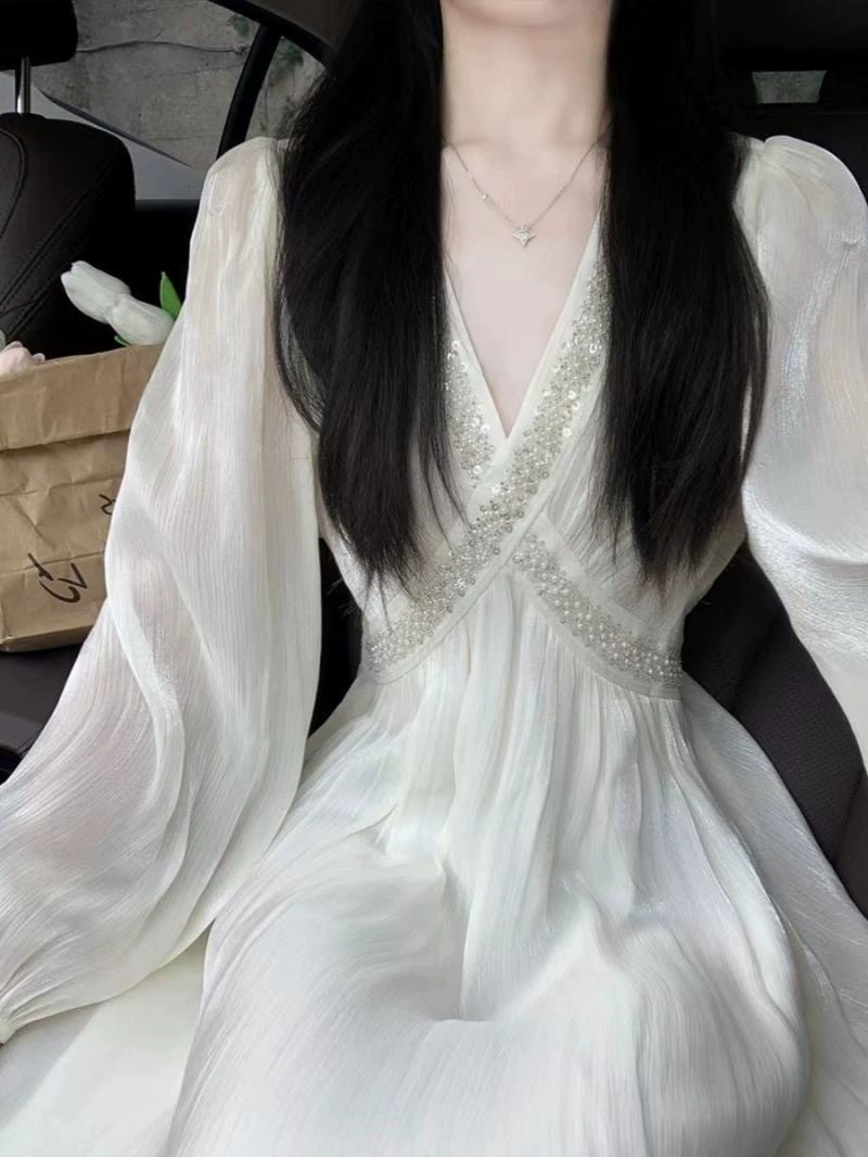 فستان صيني جديد برقبة على شكل حرف V أبيض يغطي البطن مقاس سمين