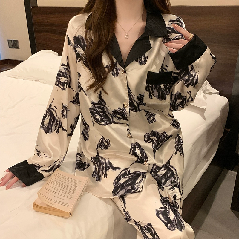 بيجامة من الحرير الجليدي للنساء للربيع والخريف بأكمام طويلة نمط رفيع مع وسادة للصدر 2023 مجموعة ملابس منزلية صيفية وشتوية جديدة من الحرير